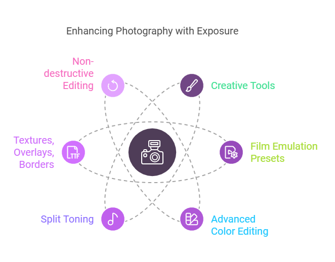 Exposure includes a variety of creative tools for photographers. You can use film emulation presets to give your photos a classic look. The software offers advanced color editing options. Split toning lets you adjust the colors in highlights and shadows separately. You can also add textures, overlays, and borders to your images.